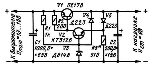 Многим радиолюбителям знакома схема этого простого стабилизатора напряжения с защитой от перегрузок и коротких замыканий цепи выхода. Он обладает рядом положительных качеств и поэтому получил широкую популярность среди радиолюбителей. Однако недостаток стабилизатора заключается в том, что порог ограничения тока нагрузки его устройства защиты зависит от статического коэффициента передачи регулирующего транзистора. Так как при разогреве транзистора его статический коэффициент передачи тока увеличивается, то увеличивается и ток ограничения стабилизатора. В результате возрастает выделяемая на регулирующем транзисторе мощность, что может привести к его перегреву и выходу из строя. Диод V4, включенный между базой управляющего и коллектором регулирующего транзистора (как показано на рисунке), практически устраняет этот недостаток. В нормальном режиме работы стабилизатора диод V5 открыт, а диод V4 закрыт и не влияет на работу устройства. Если ток нагрузки увеличивать, то выходное напряжение стабилизатора начнет уменьшаться, диод V5 закроется, а транзистор V2 совместно с резисторами R1, R3 и стабилитроном V3 будет работать как стабилизатор тока. В связи с этим базовый ток регулирующего транзистора V1, а значит, и его коллекторный ток оказываются ограниченными. Одновременно с закрыванием диода V5 открывается диод V4, шунтирует стабилитрон V3, и он выходит из режима стабилизации. Это приводит к уменьшению напряжения на базе транзистора V2 и соответственно к уменьшению тока ограничения. Если в качестве диода V4 применить светодиод, например, АЛ102А, то он будет служить индикатором перегрузки стабилизатора, но в этом случае ток короткого замыкания стабилизатора несколько увеличивается вследствие большего падения напряжения на переходе светодиода. Подробное описание стабилизатора приведено в [ 7 ].
